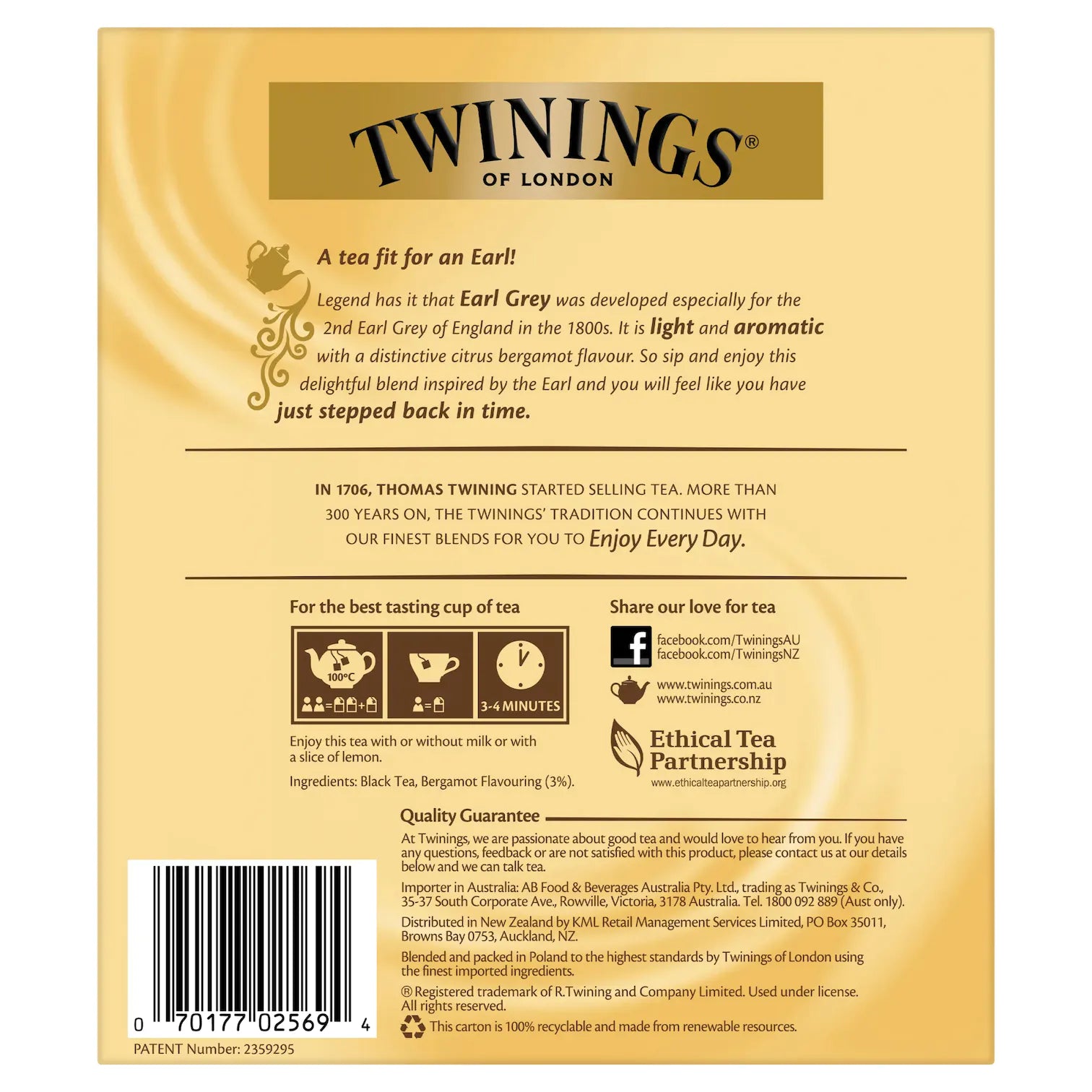 First created by Twinings in 1831 for the British Prime Minister the 2nd Earl Grey of England, this iconic loose leaf blend perfectly balances citrusy bergamot flavour with a gentle black tea base. Earl Grey is also available in loose leaf